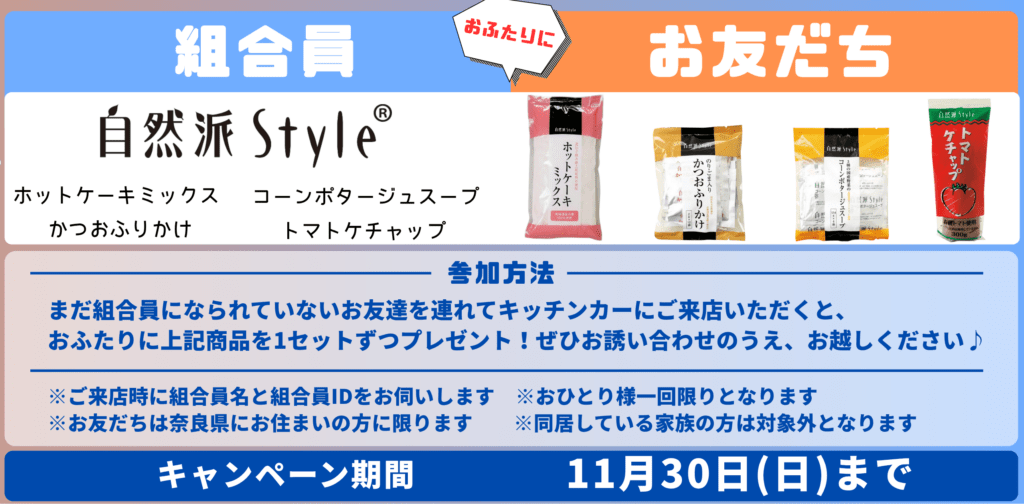 お友だちと一緒にキッチンカーにご来店いただくと、おふたりに自然派Styleセットをプレゼント!