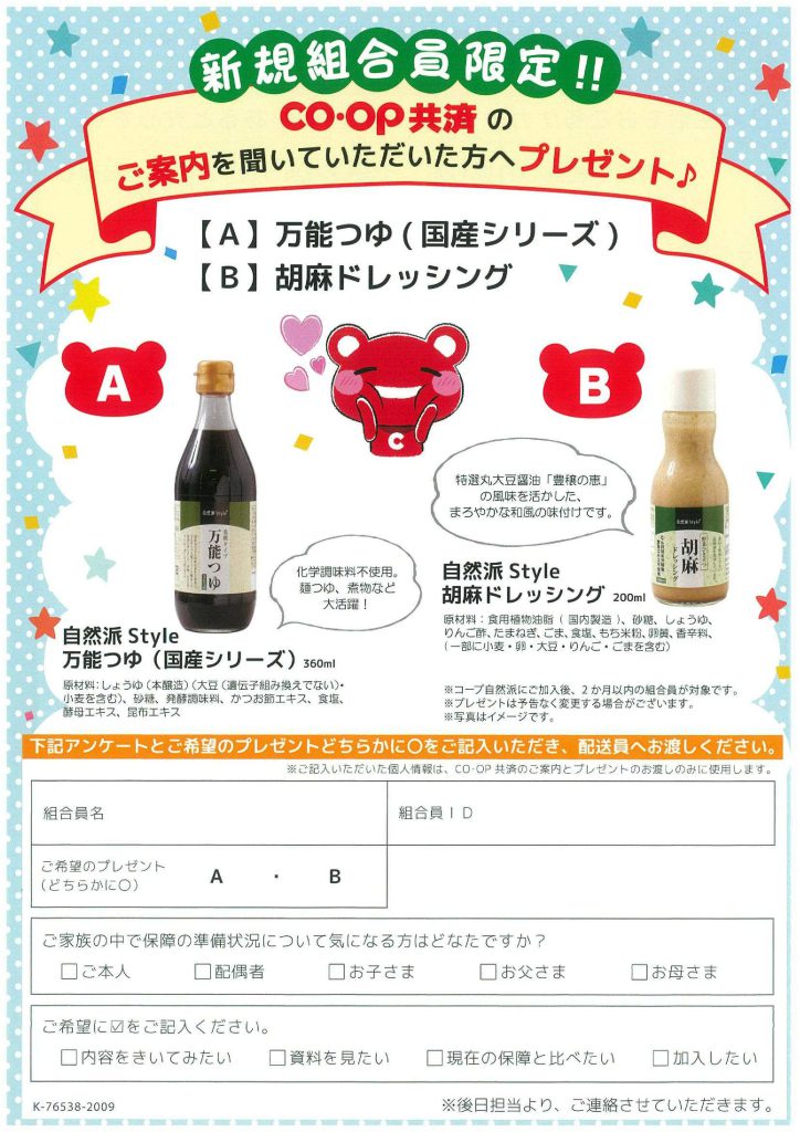 コープ自然派では食品だけでなく、万が一のケガや入院に備えておける、コープ共済も取り扱っています。組合員様限定商品ですので是非この機会にご加入を!!