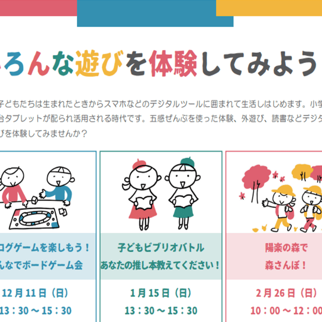 「ボードゲーム」と言えばすごろくや人生ゲームが思い浮かぶかもしれませんが、それだけではありません。ヨーロッパ、特にドイツや北欧ではとても親しまれていて、多種多様、いろいろなボードゲームがあるんです。今回はアナログゲームインストラクター中川さんおすすめの、幅広い年齢で楽しめるゲームをみんなで遊んで体験します。デジタルゲームにはない、アナログゲームの魅力、楽しさをぜひ知ってください。親子参加も、お一人様も歓迎です!お気軽にご参加ください。※子どもゆめ基金の助成を受けて開催します。
