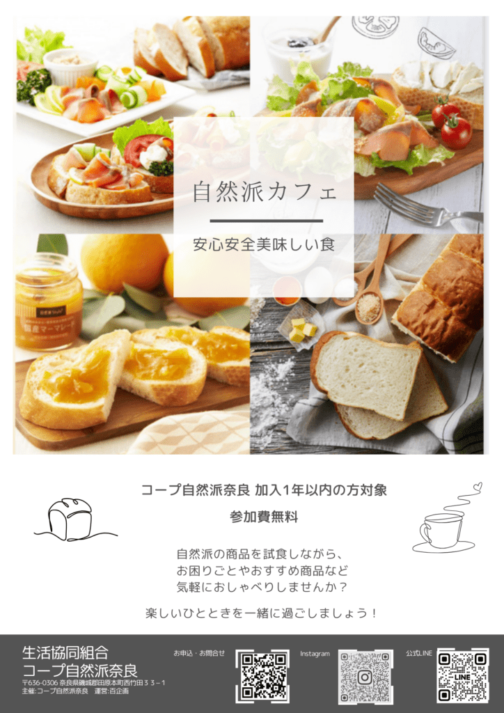 コープ自然派奈良では、 1年以内にコープ自然派奈良に加入された方向けに 【自然派カフェ】 を開催します。コープ自然派の商品を実際に試食しながら、 利用する中でわかりにくいことや困っていること、お気に入りの商品や探している商品など質問やお悩みを話せる交流の場です。