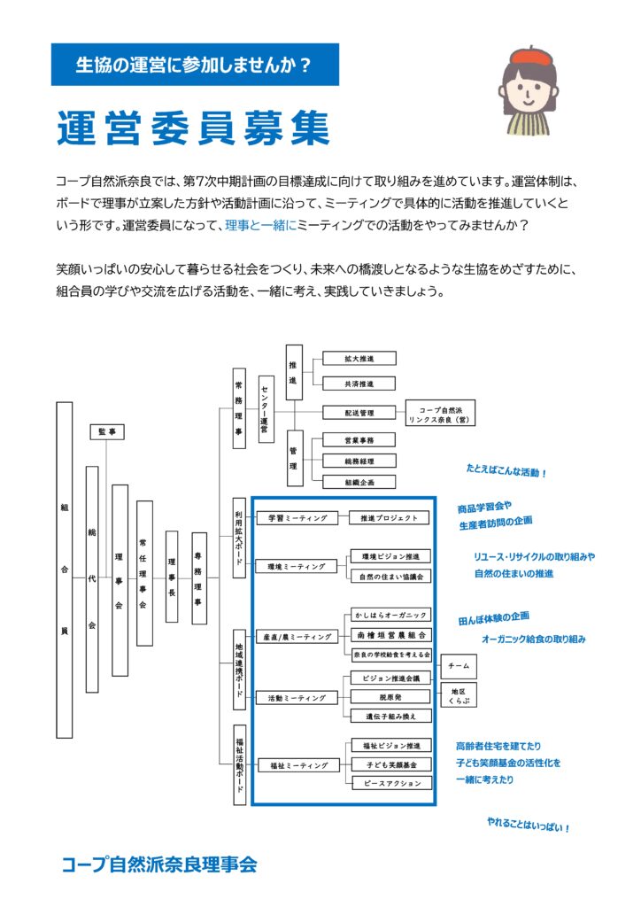 コープ自然派奈良では、第7次中期計画の目標達成に向けて取り組みを進めるにあたり、理事が立案した方針や活動計画に沿って、活動をサポートする運営委員を募集します。